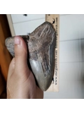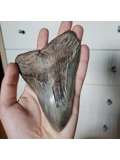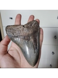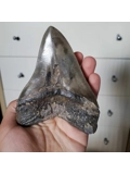 A pretty great quality 5inch+ all natural Megalodon fossil shark tooth from South Carolina. Missing some parts of the enamel but the serrations are wonderfully intact and sharply serrated on this glossy beast.