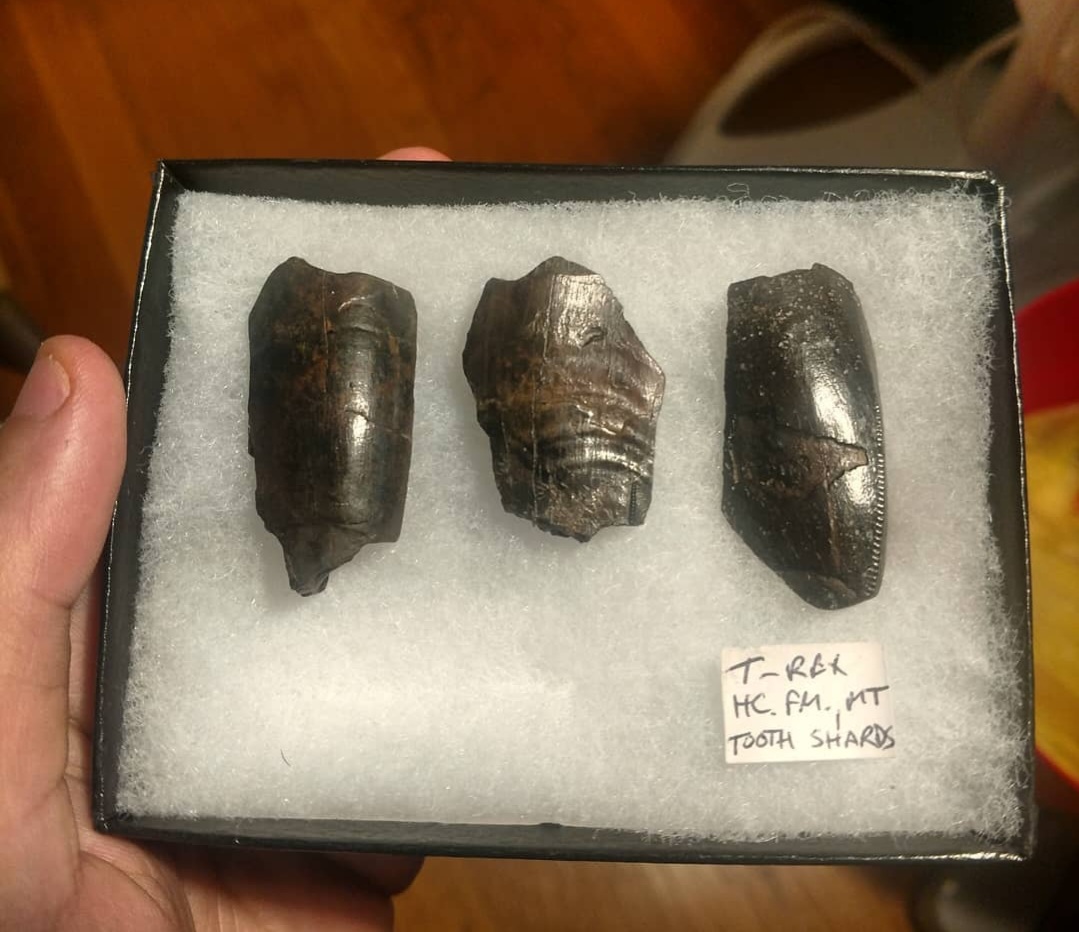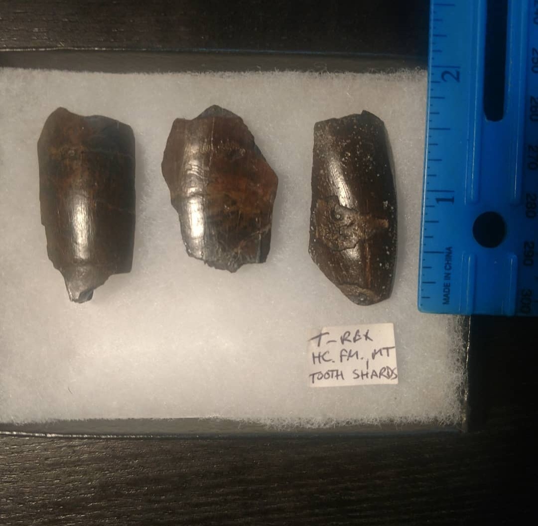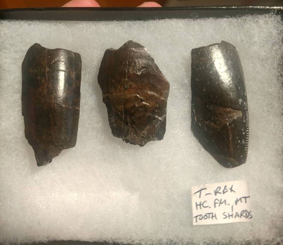 A lot of three shards of fossil tooth from the iconic tyrant dinosaur king of the cretaceous tyrannosaurus rex! These teeth were found in the hell creek formation of Montana.