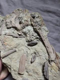 One of my favorite kind of fossils to offer, here is a hadrosaur you can hold in the palm of your hands! A piece of sandstone contains various associated elements of the hadrosaur dinosaur Edmontosaurus Annectens including mostly bones, tendons, and teeth/ shed teeth bits. This piece was collected from the Cretaceous dinosaur aged Lance Formation of Weston County, Wyoming.