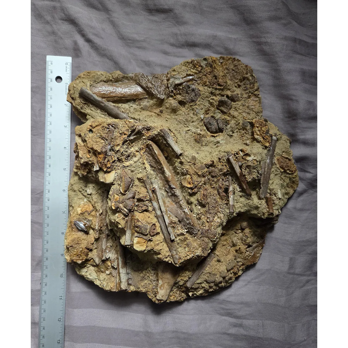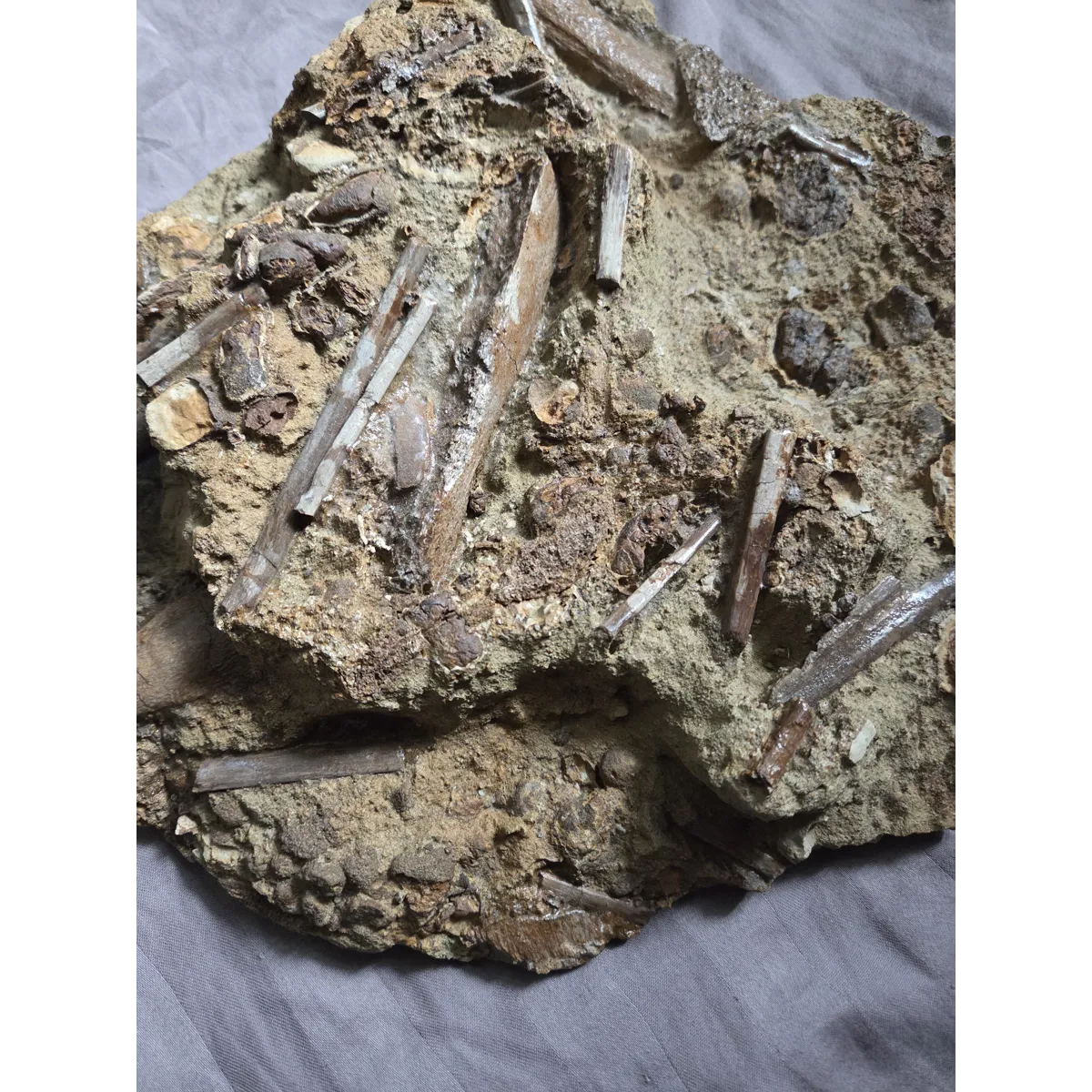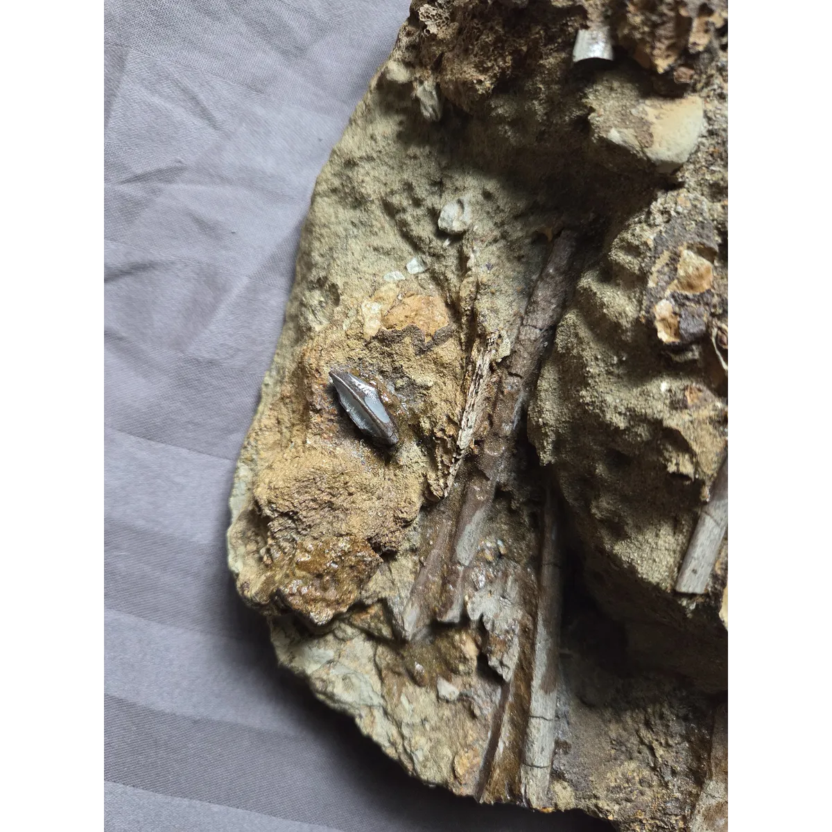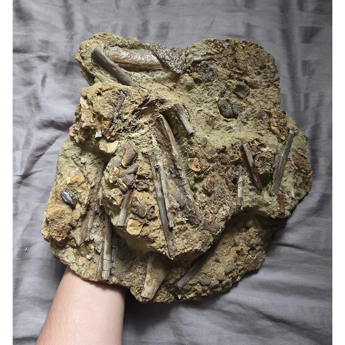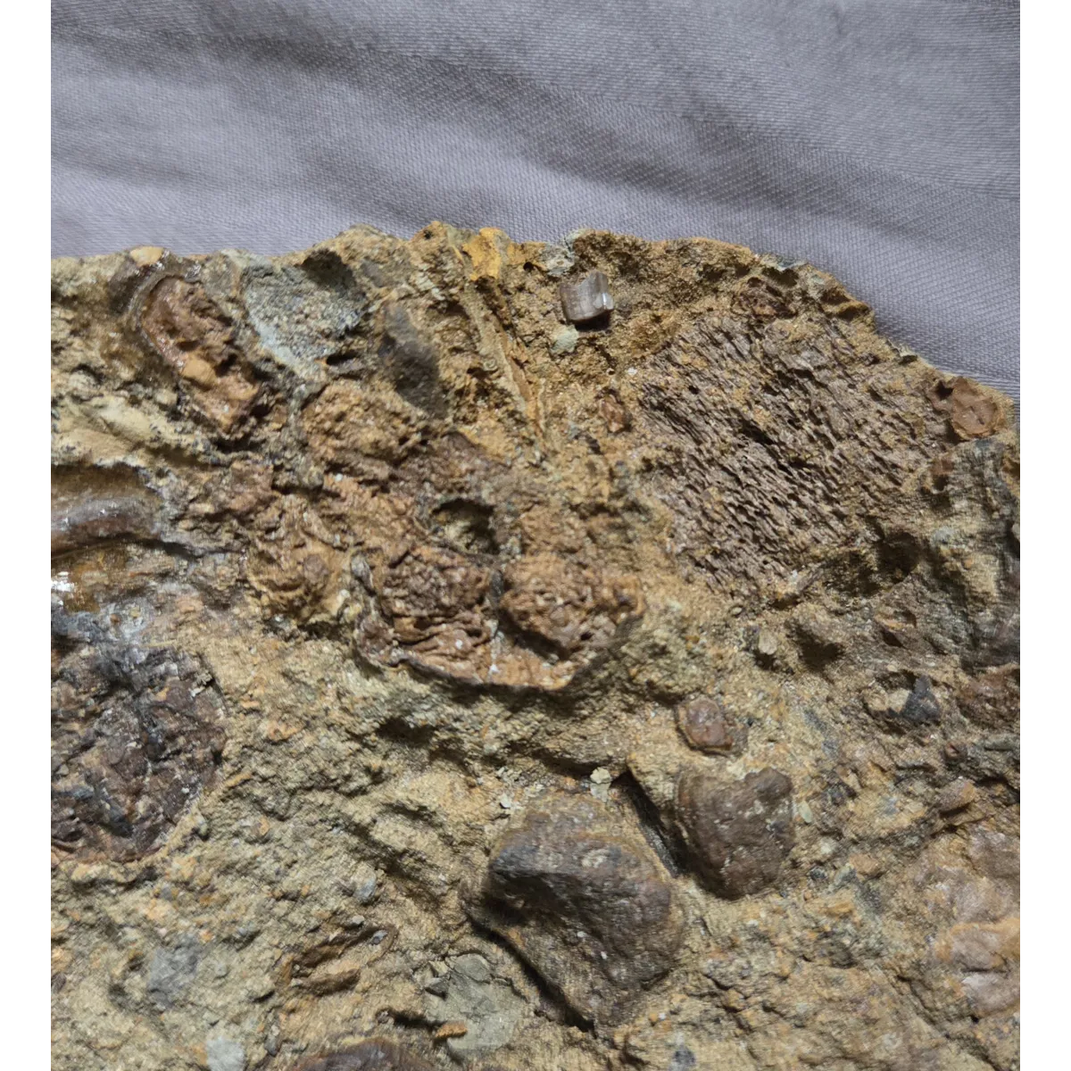 One of my favorite kind of fossils to offer, here is a hadrosaur you can hold in the palm of your hands! A piece of sandstone contains various associated elements of the hadrosaur dinosaur Edmontosaurus Annectens including mostly bones, tendons, and teeth/ shed teeth bits. This piece was collected from the Cretaceous dinosaur aged Lance Formation of Weston County, Wyoming.