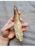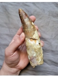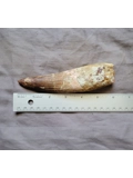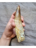 This is a large fat fully rooted Spinosaurus tooth from the Kem Kem Basin in Morocco and is Late Cretaceous in age, approximately 95 million years old. There is some good news and bad news about this tooth. To start with the bad news it was repaired from a root break with a few missing pieces and has minor work on the tip. Now here's the good news, with the break in the root you can see clearly the interior and confirm for 100% certainty the root is a an actual natural root in a market where the vast majority of large Spinosaurus teeth offered have completely fake and bone carved roots. Also the break is not on the display side so just with only a minor crack running through the front it looks stellar and impressive on display or in a riker. This tooth even has some of nice striation detail preserved. Heres your rare chance at a rooted dinosaur tooth, especially Spinosaurus were there is no worries about the root being a fabrication at all. Please check photos for size and condition.