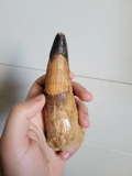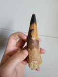 A great and large chunky 5 inch range fossil Spinosaurus tooth from the Kem Kem Basin in Morocco and is Late Cretaceous in age, approximately 95 million years old. Has some work on the tip but the rest is all natural and is a great thick, heafty tooth in hand.