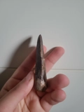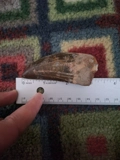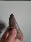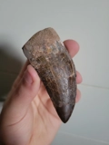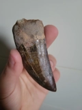 This is a large Carcharodontosaurus tooth from the Kem Kem Basin in Morocco and is Late Cretaceous in age, approximately 95 million years old. The very tip of this tooth is a comp but is accurate. This keeps the price very cheap for the color/size combination. Please check photos for size and condition. Cheap price for the size!