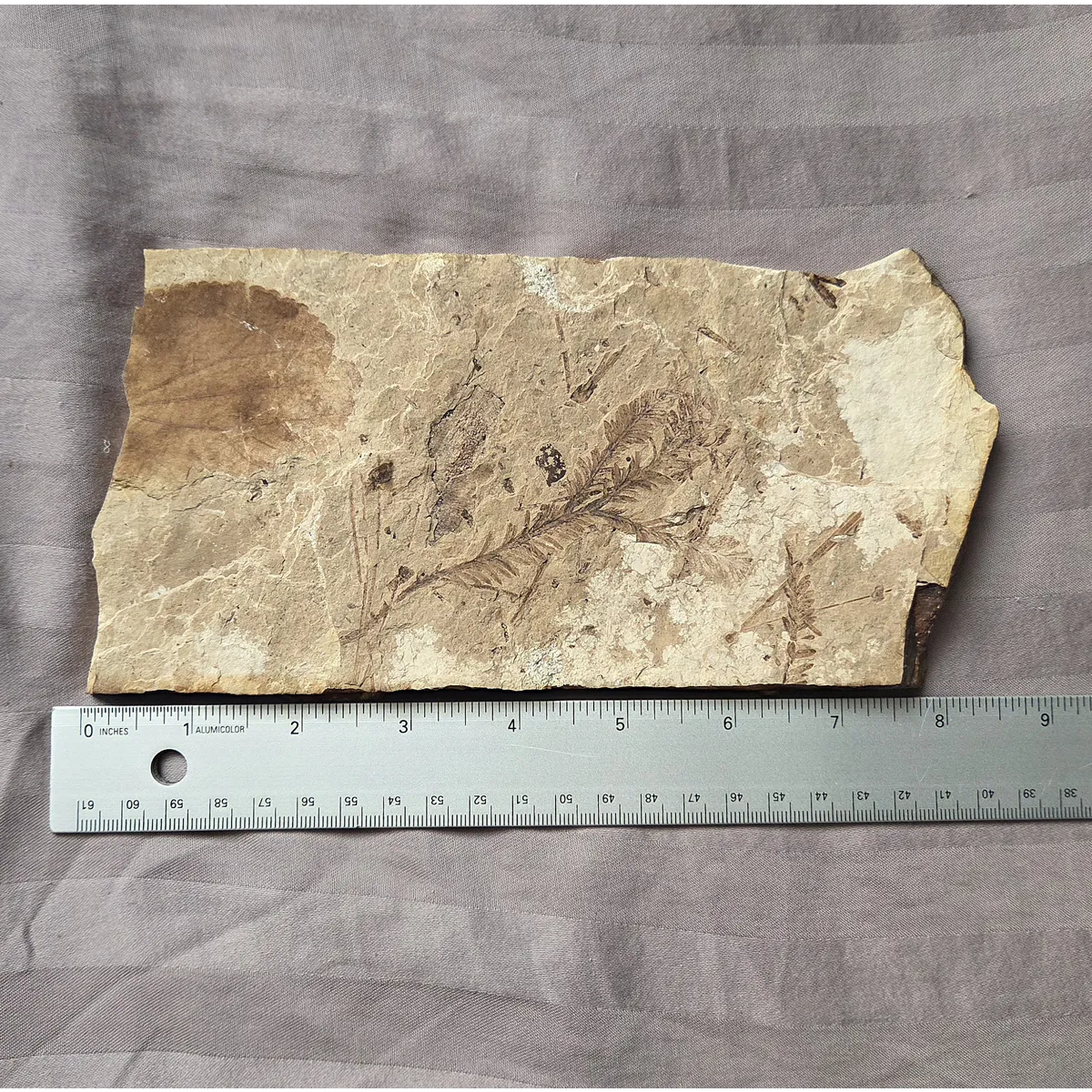 Here we have a quality plate, a forest floor of leaf fossil leaves and plant material from the McAbee fossil beds of British Columbia, Canada. The front side has multiple plant specimens including a Metasequoia and Pine sp, the backside has only a little bit of plant material. The Tranquille Shale of southern British Columbia was formed during the Eocene, about 50 million years ago as diatoms in the lake bloomed and died in an ancient lake covering the region, fossils were preserved in the lakebed in accumulating fine layers of silt. In 2012 the McAbee Fossil Bed was acquired by the Canadian government and declared a Canadian Heritage Site, so this material is scarce and no additional material will be coming to the market from the site. Heres your opportunity to own a great aesthetic plant plate from a rare locality!