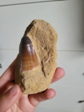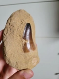 This is a Prognathodon Curri tooth, one of the more uncommon and larger mosasaur species found in Ouled Abdoun Basin in Morocco, Upper Cretaceous 66 million years old.