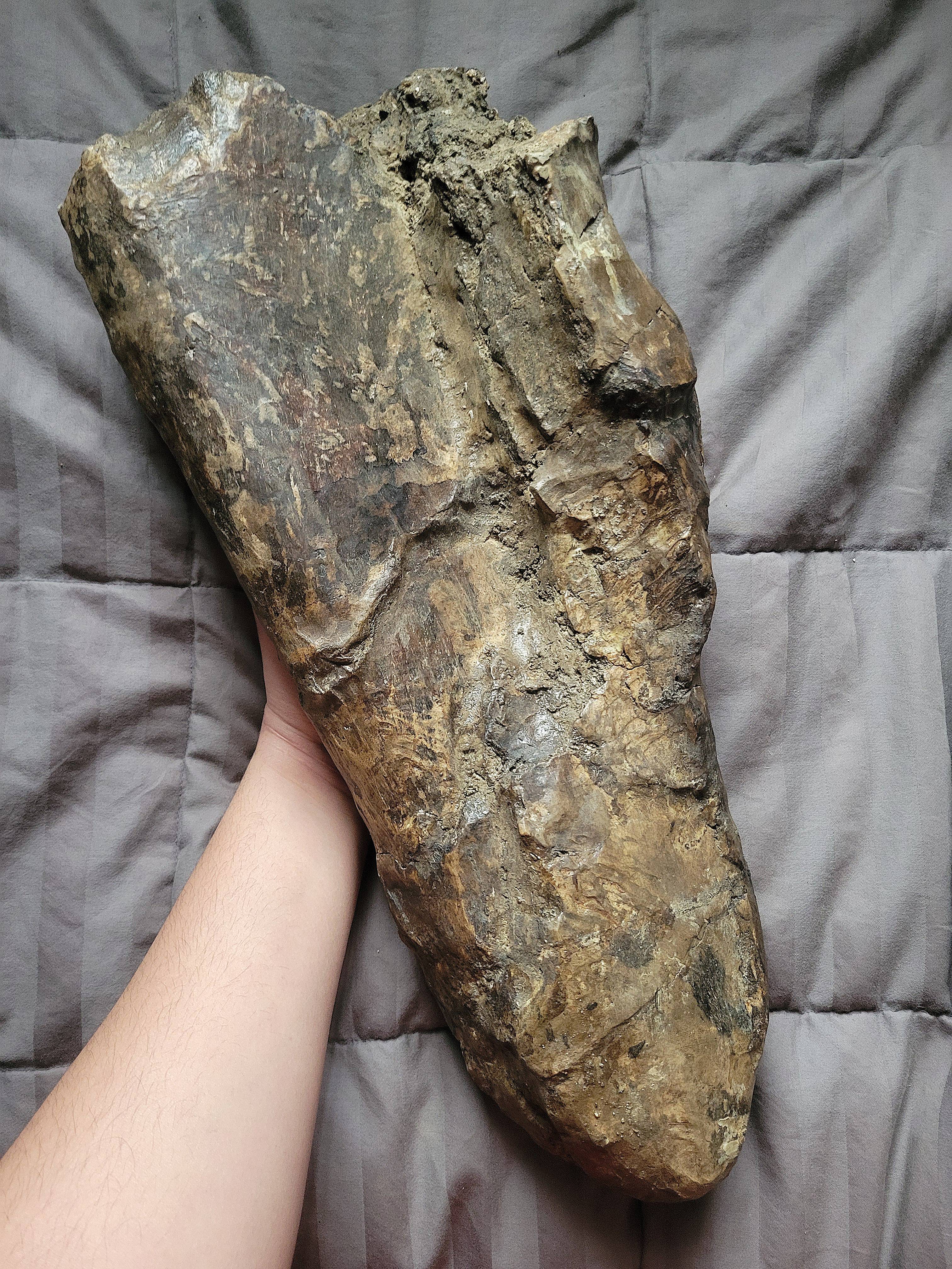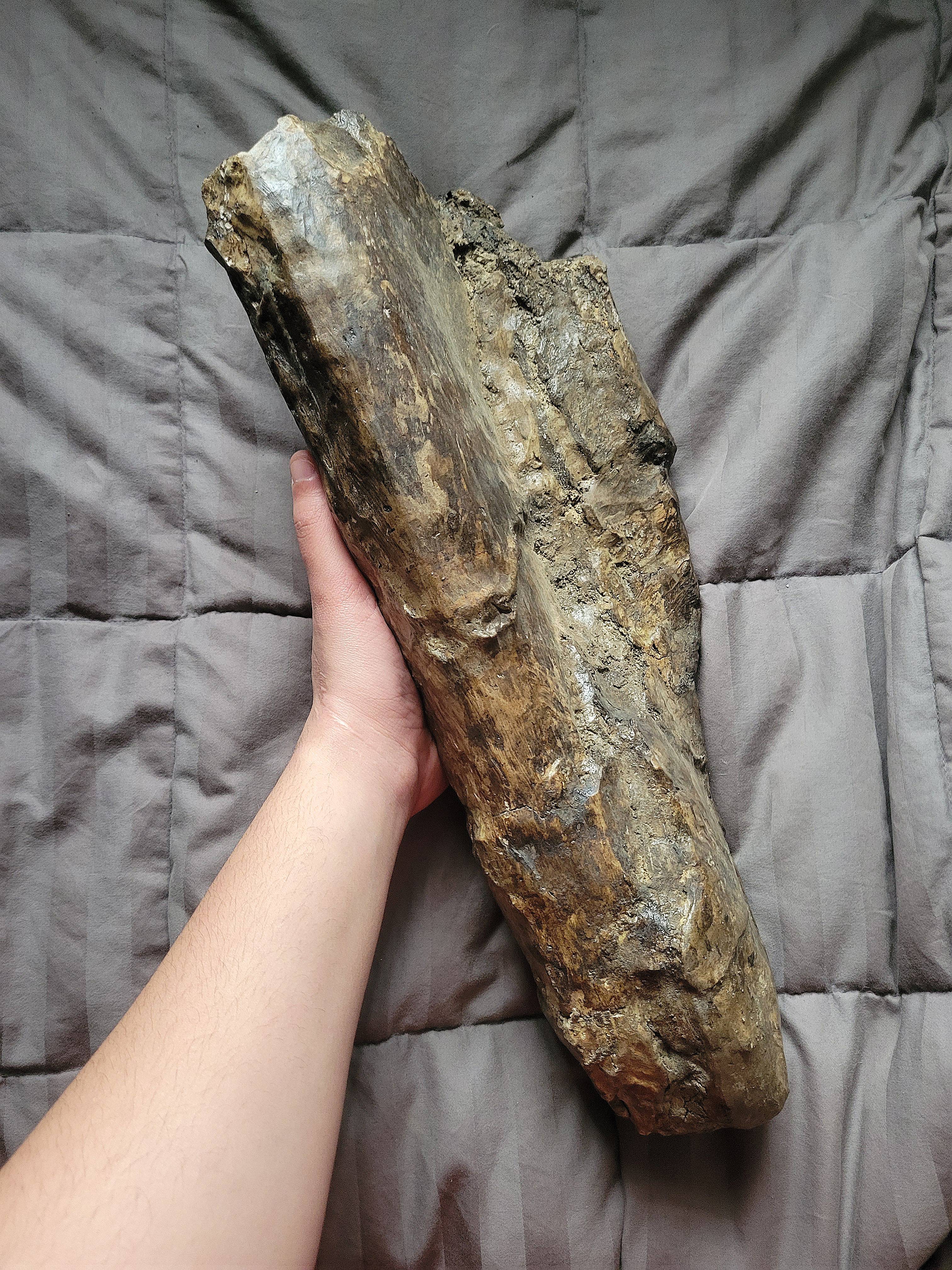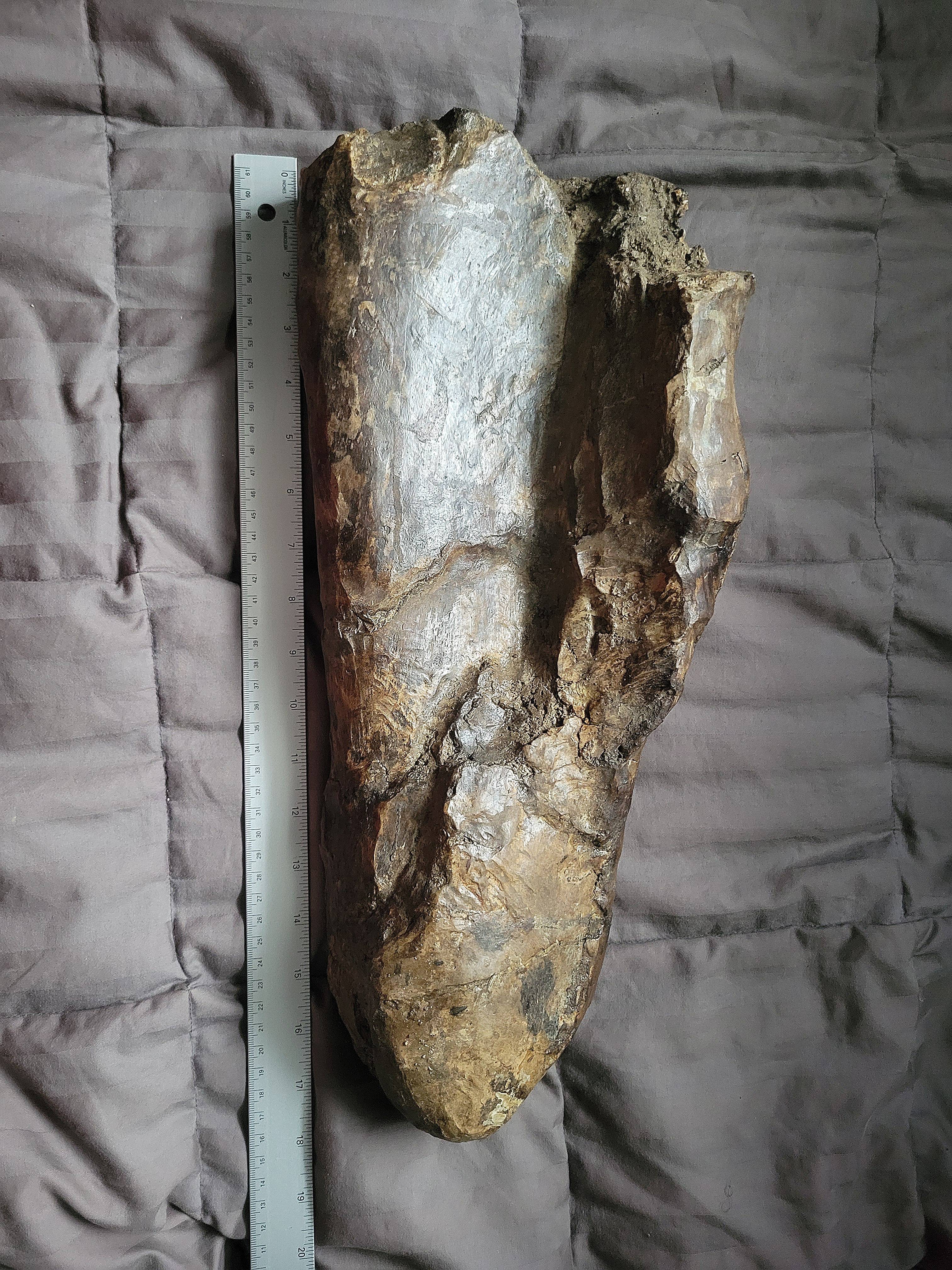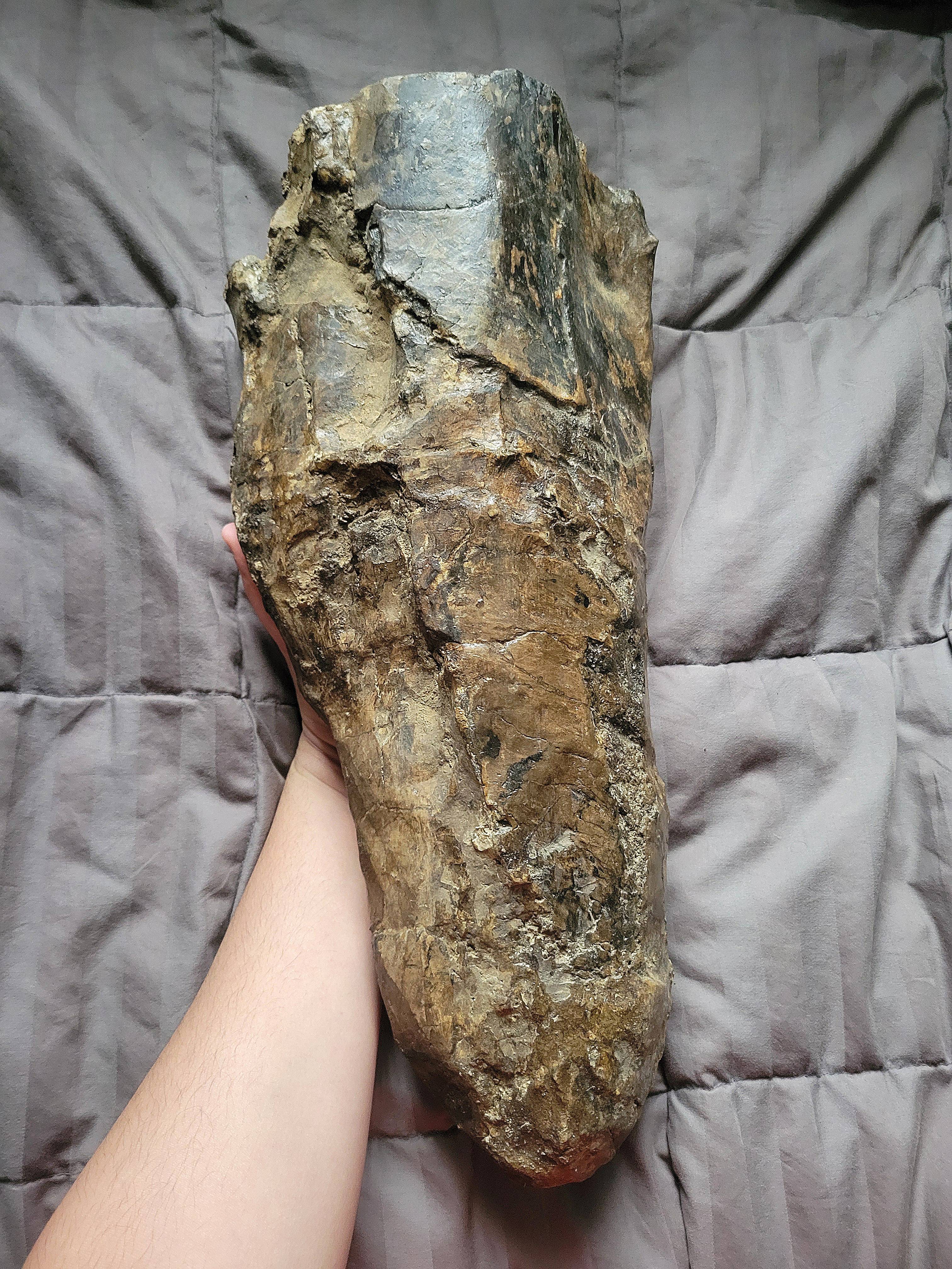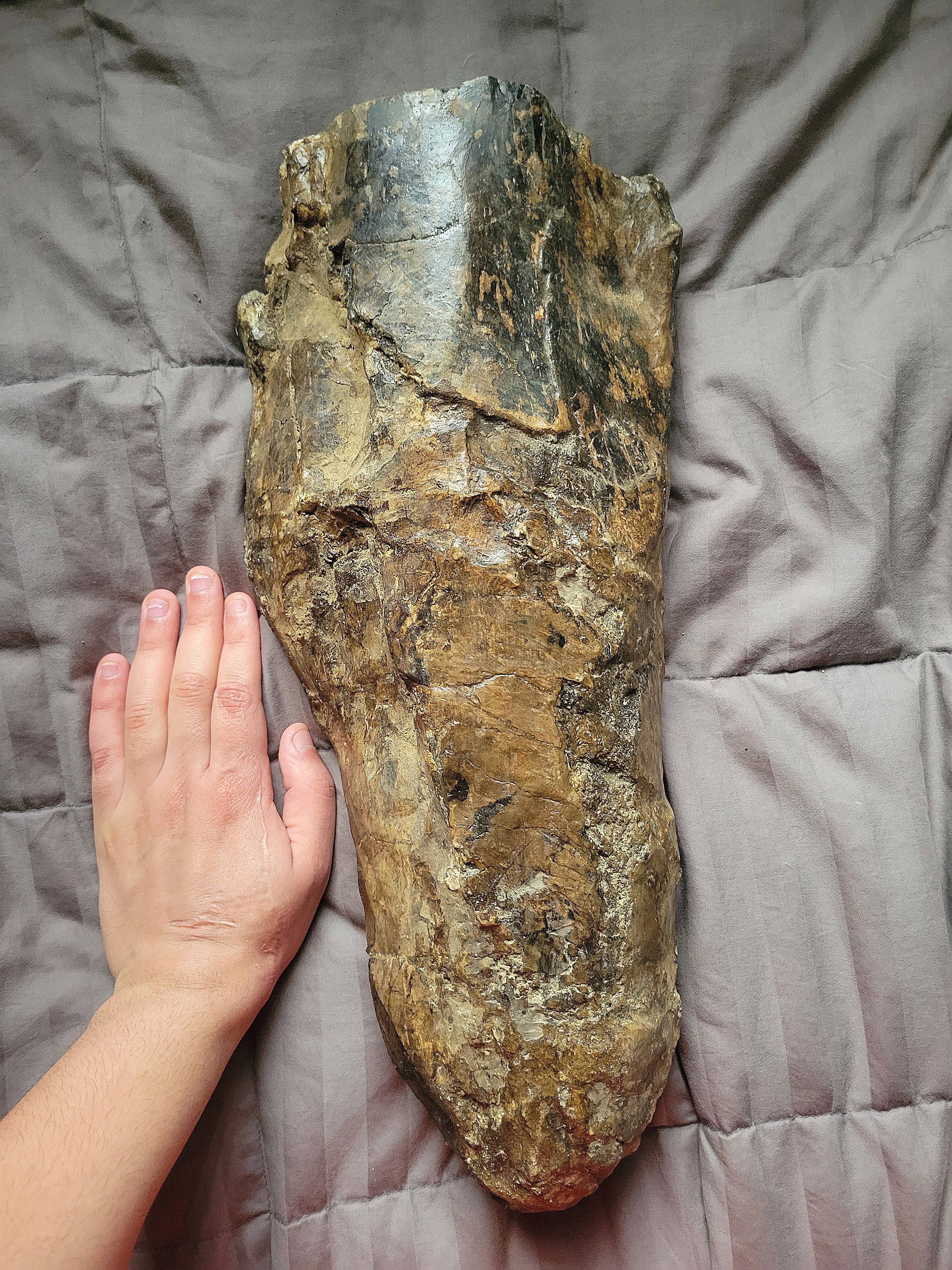 Heres a large colossal size piece of a Hadrosaur limb bone partial fossil from the Cretaceous Hell Creek Formation of Montana. This bone appears to be from the area just below the end of a giant femur and has some work done to it to keep it sturdy and protected. Great opportunity to own a giant dinosaur bone for a good price.