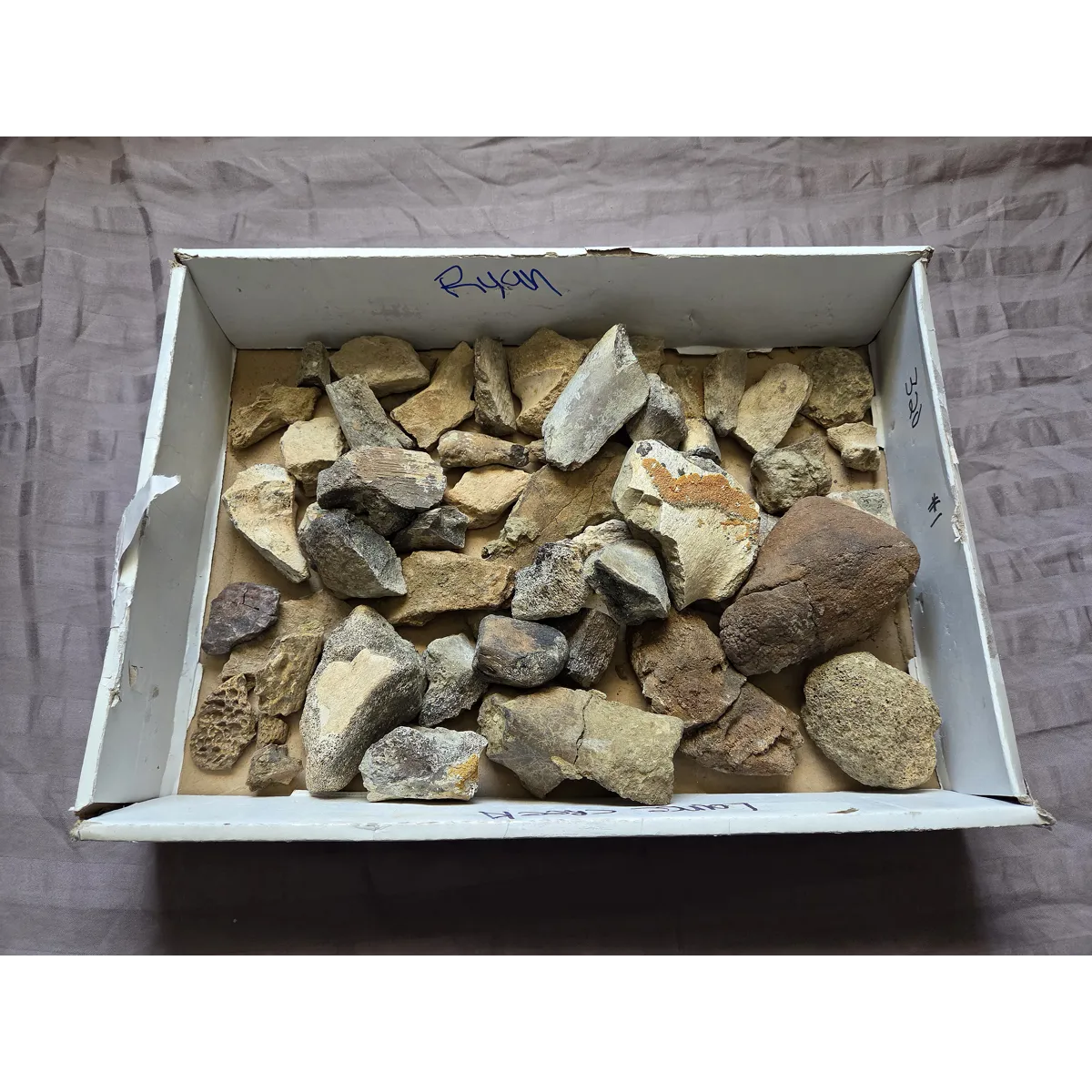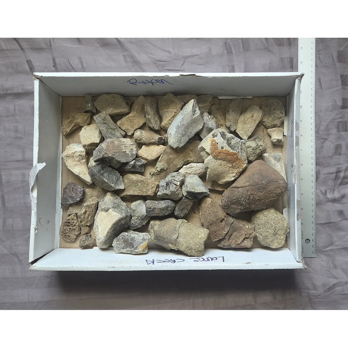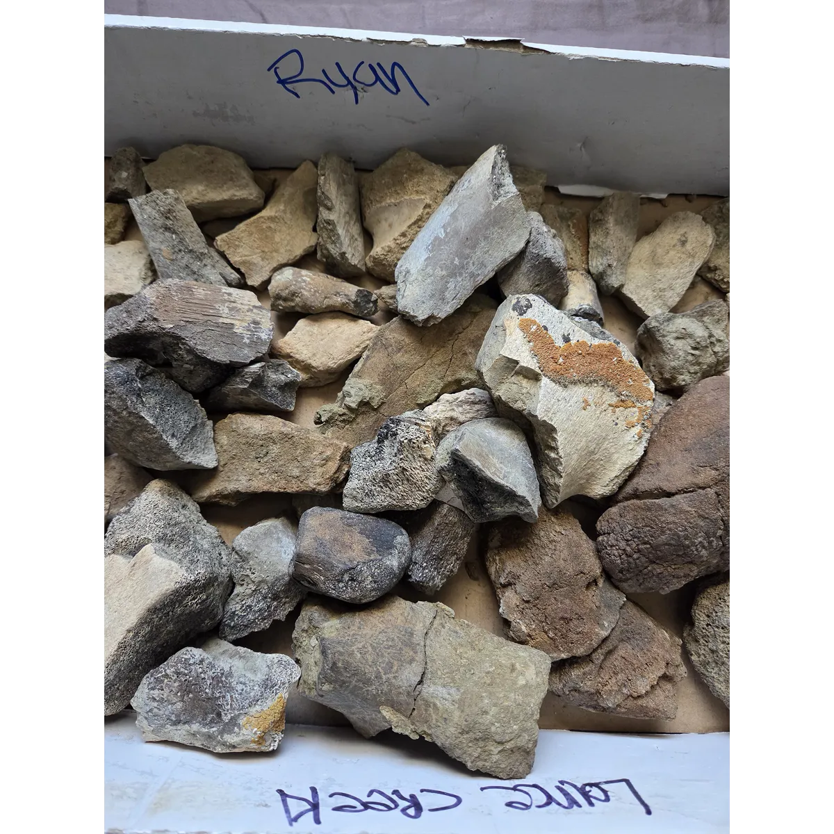 Here is a flat of various partial dinosaur and reptile bone found on private land in the Cretaceous Lance Formation of Wyoming. This was a flat I was planning to sort through but it looks like I won't have the time to do for awhile. So here I will offer it for the time being until I have to free time to properly sort to individually listed. Expect bone from any of the possible Lance Formation Dinosaurs such Hadrosaurs, Triceratops, Ankylosaurs, Tyrannosaurus Rex, Nanotyrannus, Dromeosaur, etc as well as a few croc pieces. Any of these are the dinosaurs to expect to be possible in it. Some of them can be used for very light prep cleaning practice and can make a fun activity for the curious mind to sort through and attempt to figure out. If I get the time I will do it myself and list piece individually, so heres your chance to snag a great flat of material in the meantime.