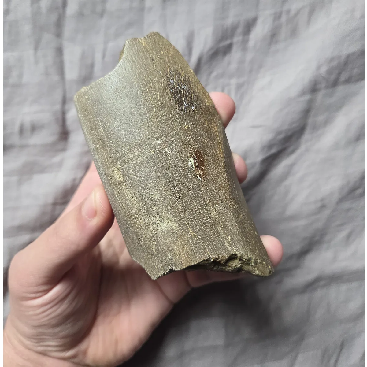 Here is a great quality chunk of tyrannosaur limb bone from likely from Tyrannosaurus Rex. This piece was found in the Hellcreek Formation of Montana. A classic example of a dense/hollowed out large theropod tyrannosaur bone with a very nicely preserved outer shell! So heres your chance to add great quality chunk of bone for your display that you could hold in your hand of the mighty king of dinosaurs Tyrannosaurus Rex!