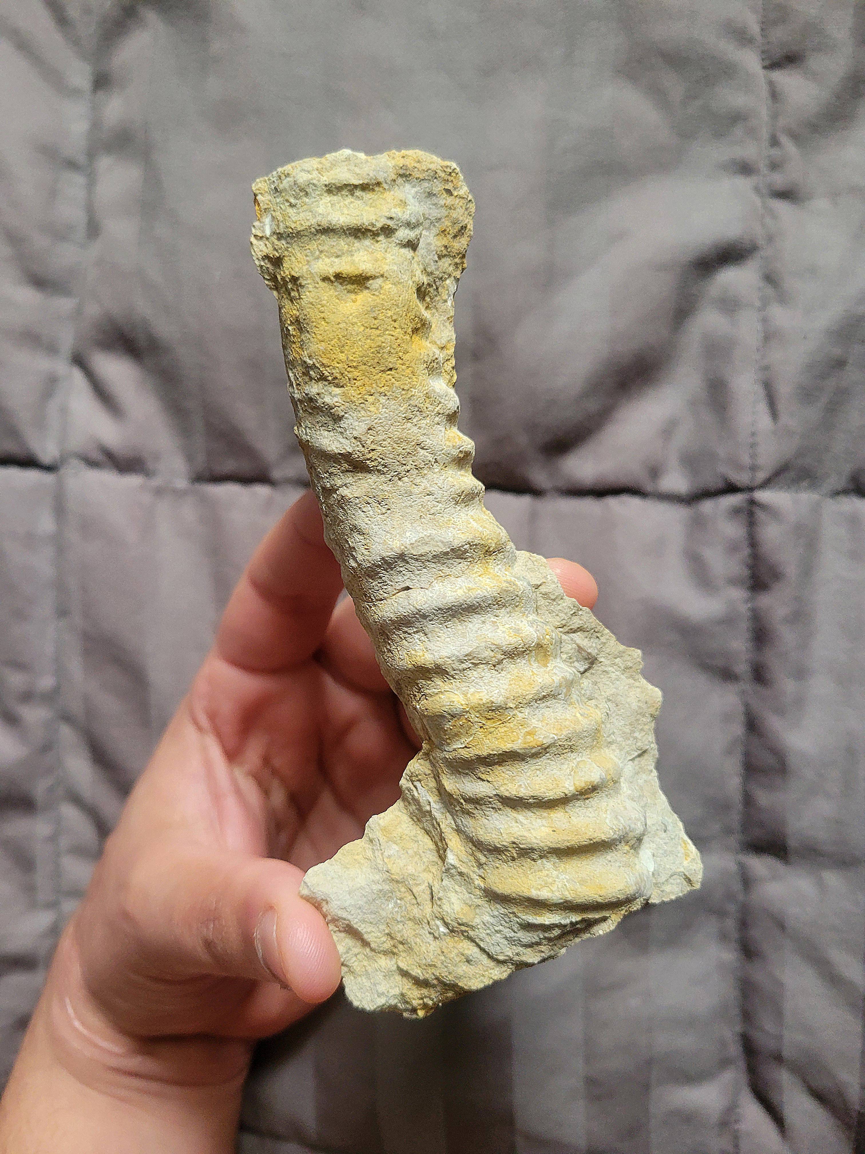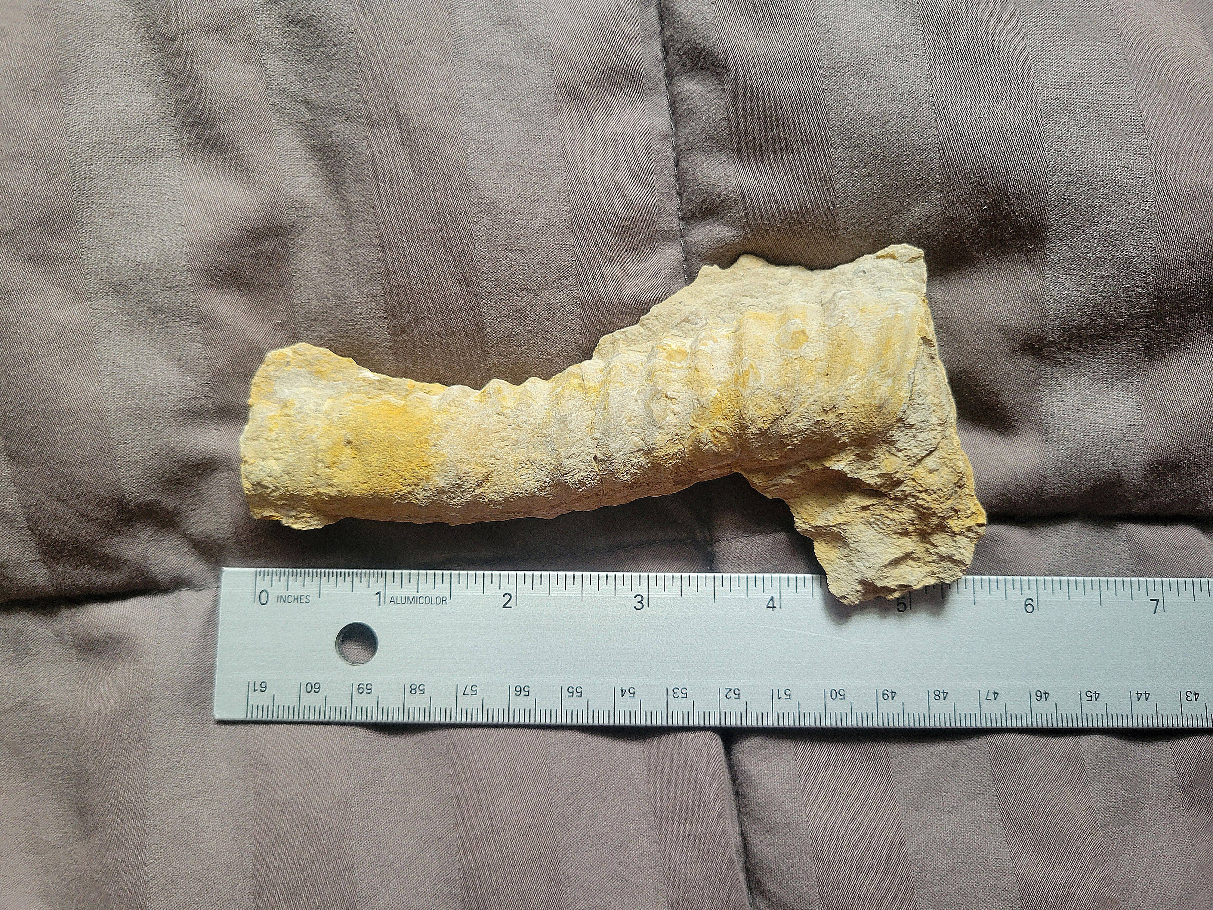 Here is a large sized Heteromorph ammonite shell fossil that was found in a creek with both duck creek and fort worth formations of North Texas, likely from an Idiohamites type. This is a nice and rare Cretaceous dinosaur aged Ammonite fossil and wonderful display piece for the shell/ammonite enthusiast. A bargain price for a big heteromorph that would be similar to Didymoceras!