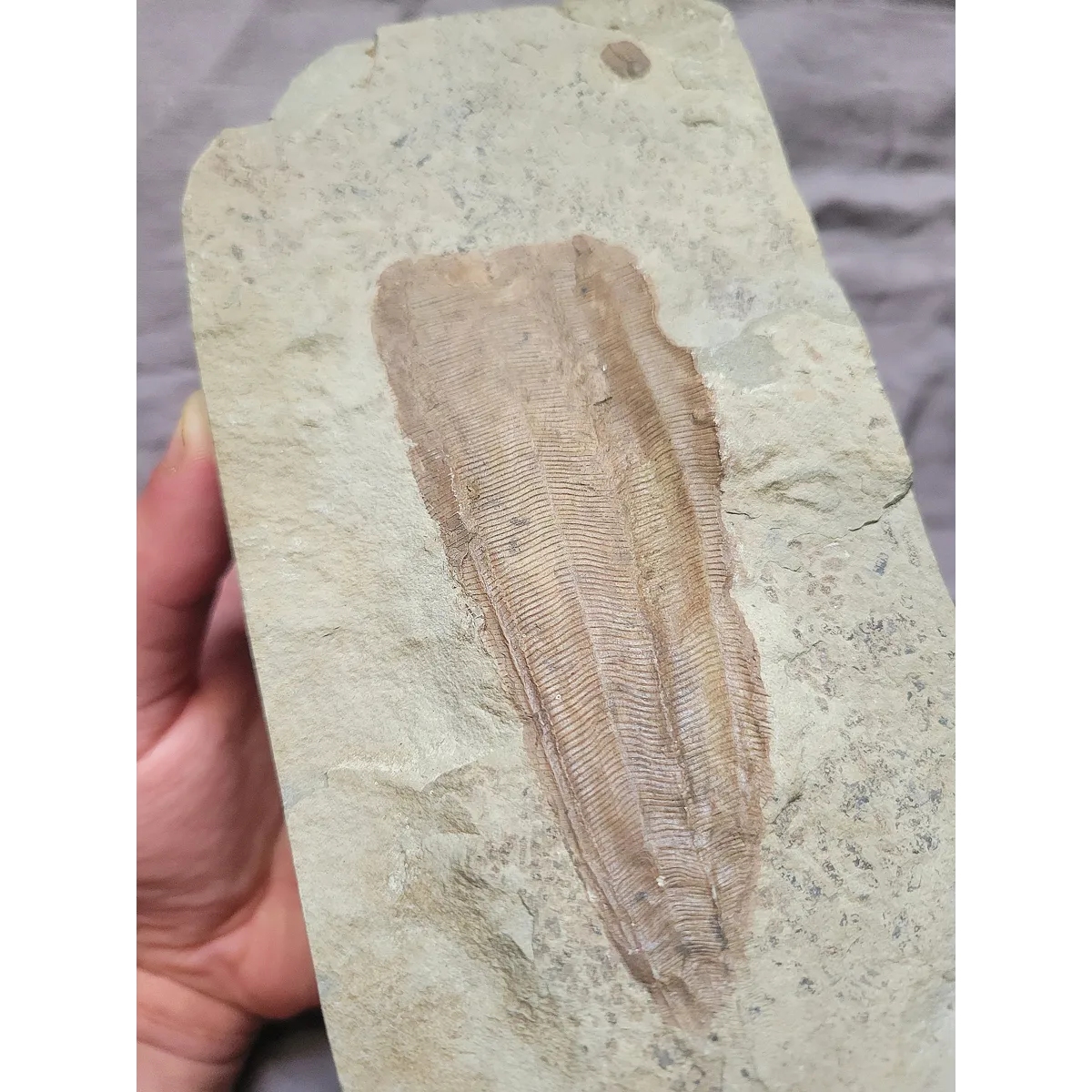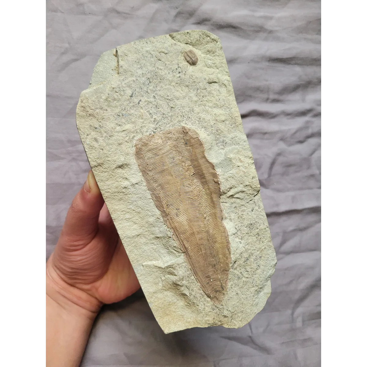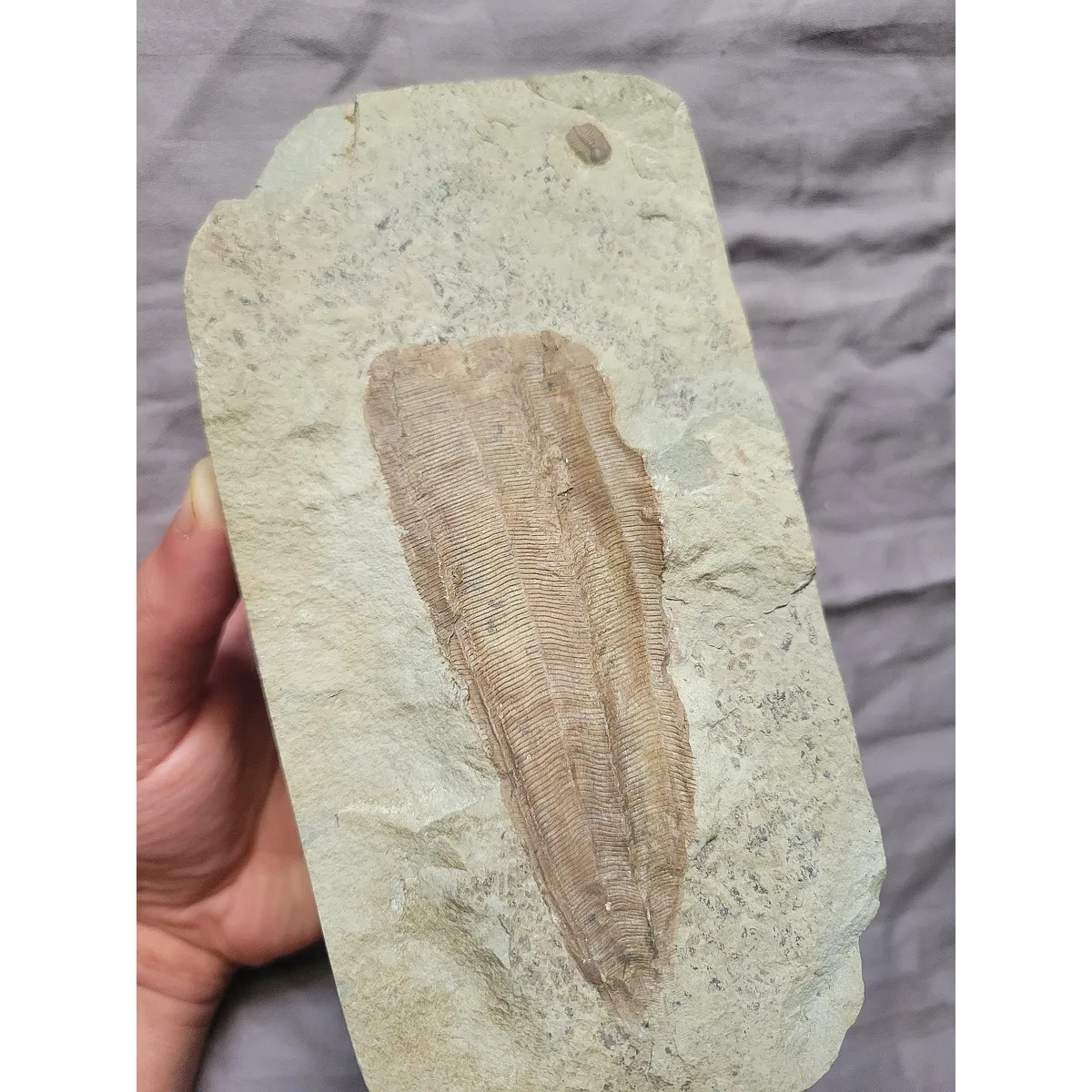 Here is an all natural and authentic museum quality example of a conulariid with a small trilobite. This piece came out of a small collection of Moroccan fossils but I am unsure of the exact providence as I have not come across such a quality specimen from there like this before. I will assume it came from Morocco as well but cannot provide much else unless further research provides me some leads. Still a stunning and one of the best examples of this creature I've seen in some time.