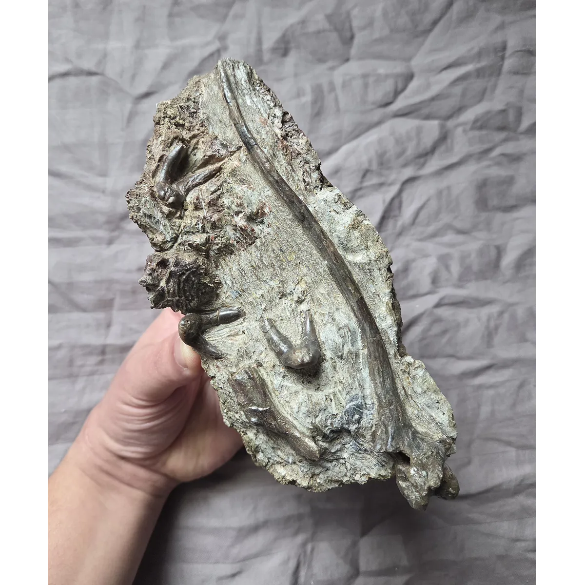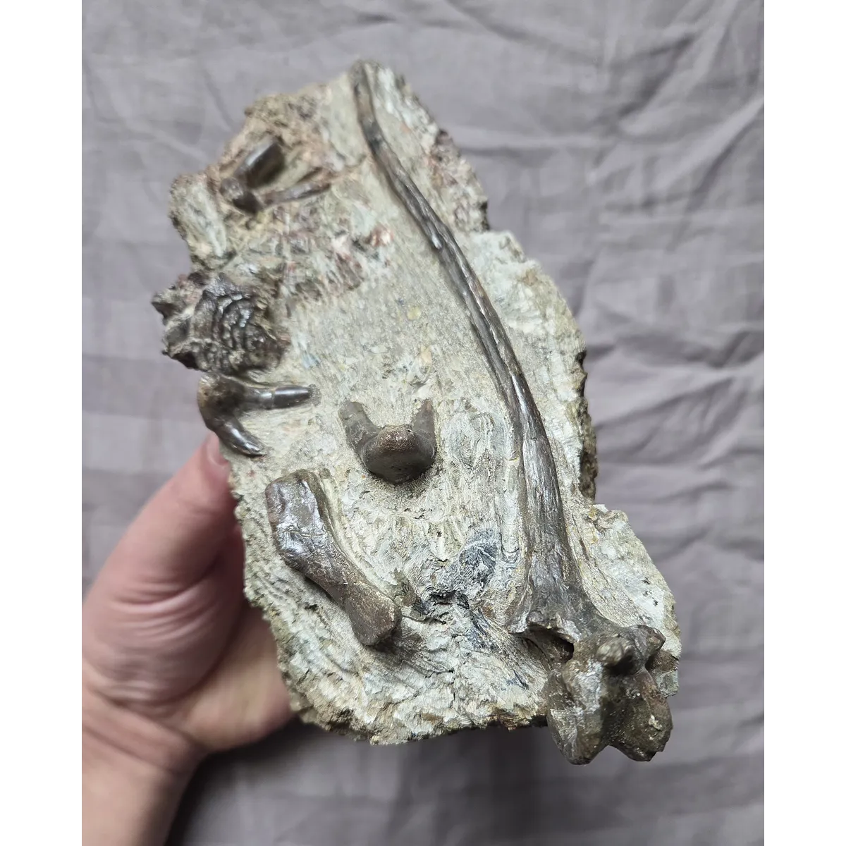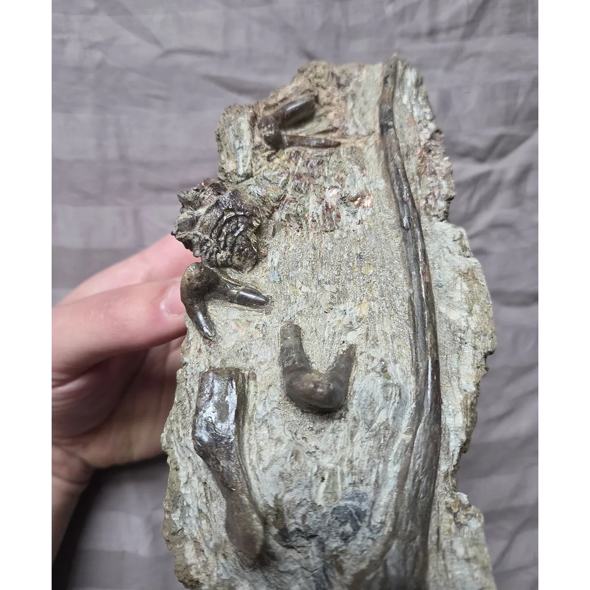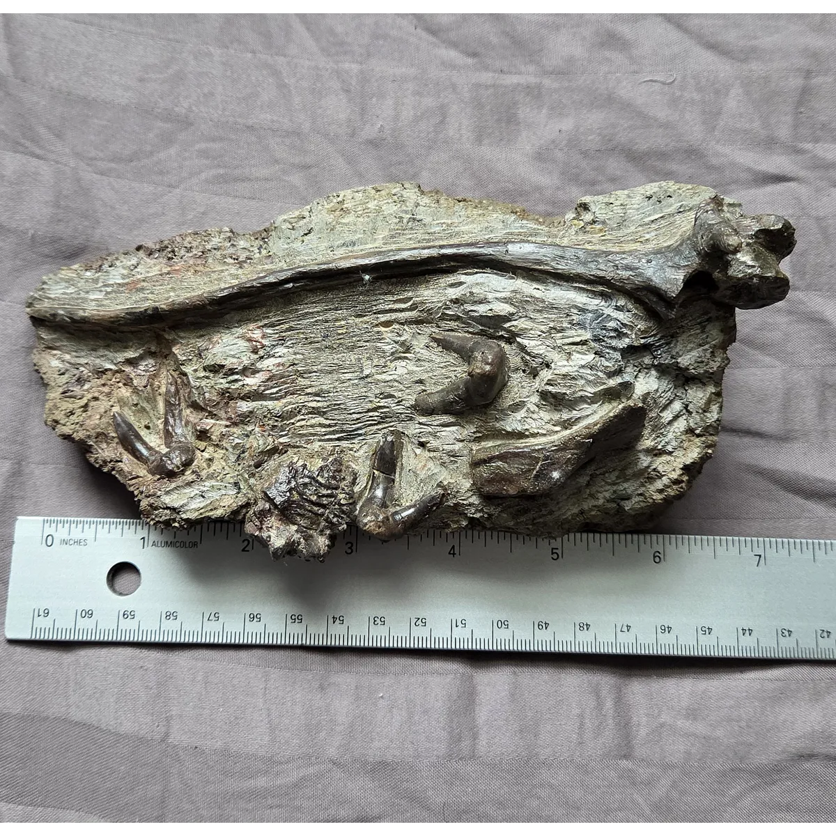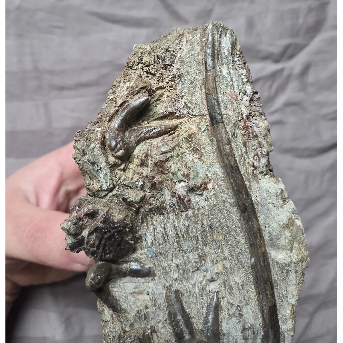 Now heres a spectacular offering of a matrix fossil association piece that is truely a one of a kind fossil! Now let me explain why you will not want to miss out on this specimen. Not only is this a beautiful display of a vertebra with a pretty much complete sail spine from the famous Dimetrodon. They are rarely offered like this at a smaller size range so it is a Dimetrodon spine example that can find in the collection of the collector who does not have the space for impressive big display pieces like most spines are. Also spines from experience are always ULTRA FRAGILE and they always BREAK for me in shipping and handling. This particular piece since it is in its natural matrix fixes the biggest issue with this kind of fossil as now there is no worry about having a spine that always breaks super easily when moving it around or having it arrive to you in broken pieces that are difficult to repair back. This one you can impressively display proudly in your collection without worry! Lets not forget and gloss over the fact there are also nice big examples of museum quality orthocanthus shark tooth fossils also within this matrix as well as a reptile skull and limb bone element. This piece was found in the Permian age (280 million year old) Ryan Formation near Waurika Oklahoma. Dimetrodon is famously mistaken to be a dinosaur but it is actually a mammal like reptile known as a synapsid. Why spend thousands of dollars on a random leg or bone element when you can own the most impressive complete best piece of the most iconic part of this animal out there. Dimetrodon is famous for its sail back, without it wouldn't be any more special than any of the other creatures of its time. So heres your opportunity to own an impressive budget friendly example of the most quintessential Dimetrodon fossil packed into a handheld collection friendly museum quality natural matrix display!