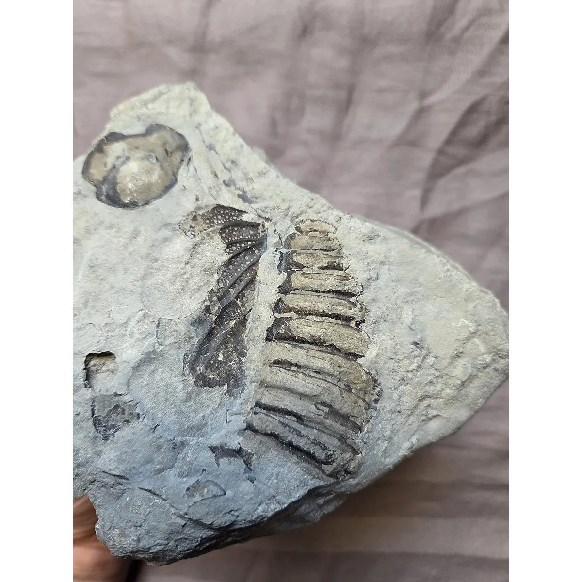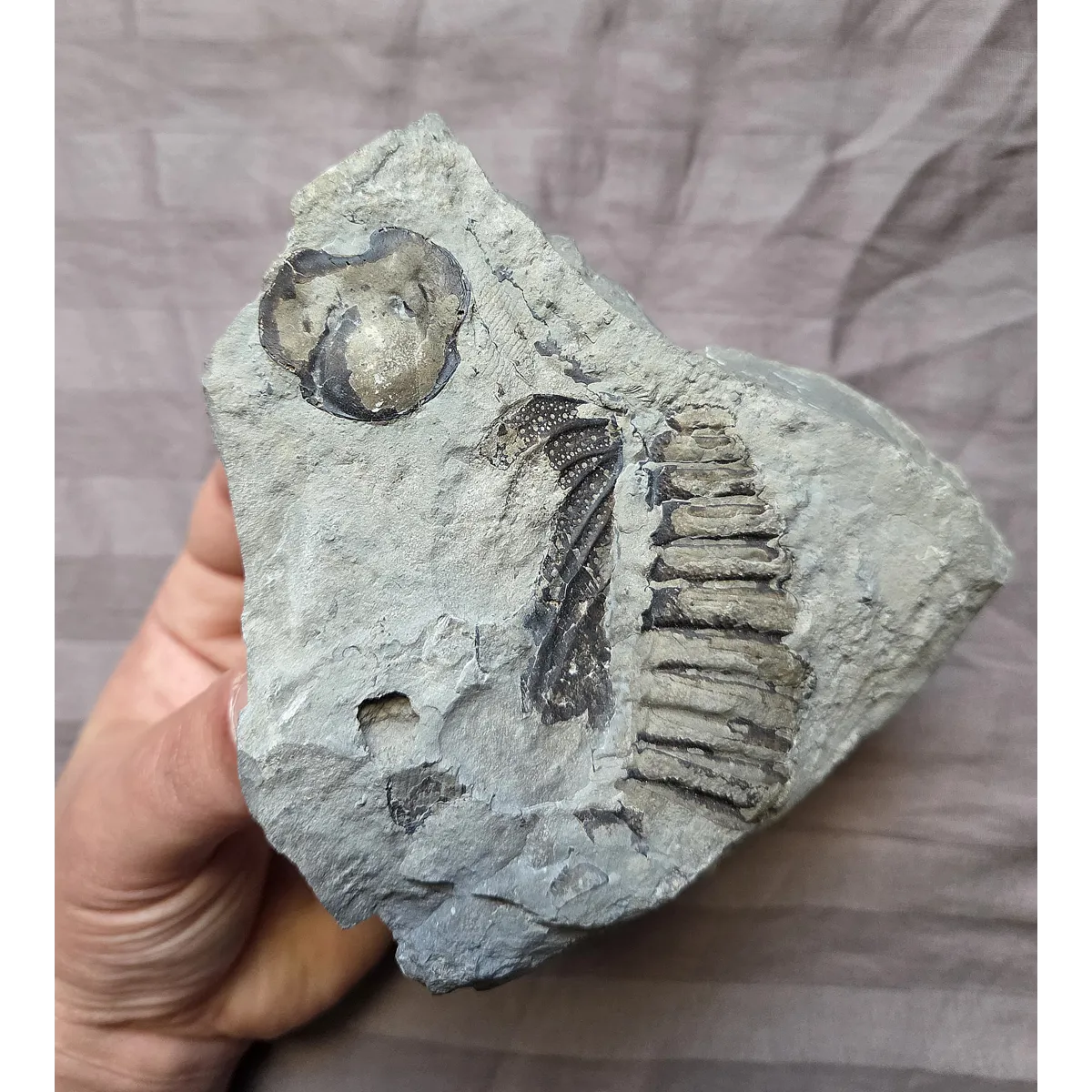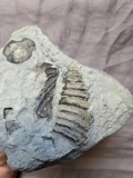 Here is a rare piece you don't see offered, the mouth plate (hypostome) of the famous lichid trilobite Arctinurus Boltoni from the famous Silurian Age Rochester Shale of Middle Port, New York. This one has also multi partials of the body. Material from this private quarry is getting more difficult to obtain as it does not produce new material anymore. So here is your chance at a cool and rare display piece from this locality at a bargain price as these trilobites typically go for around 1k plus!