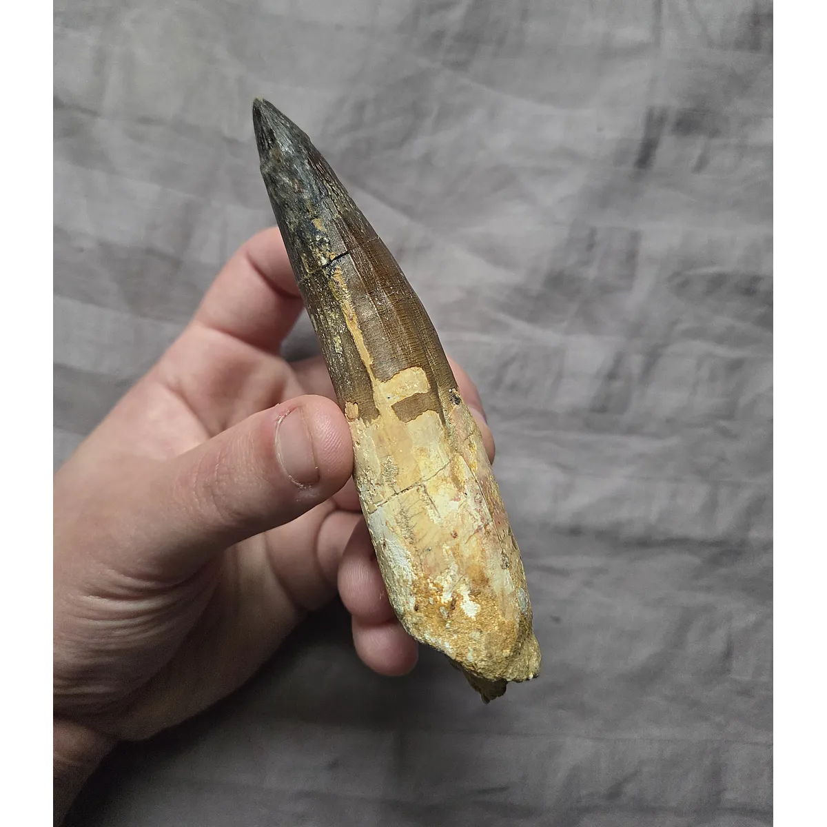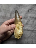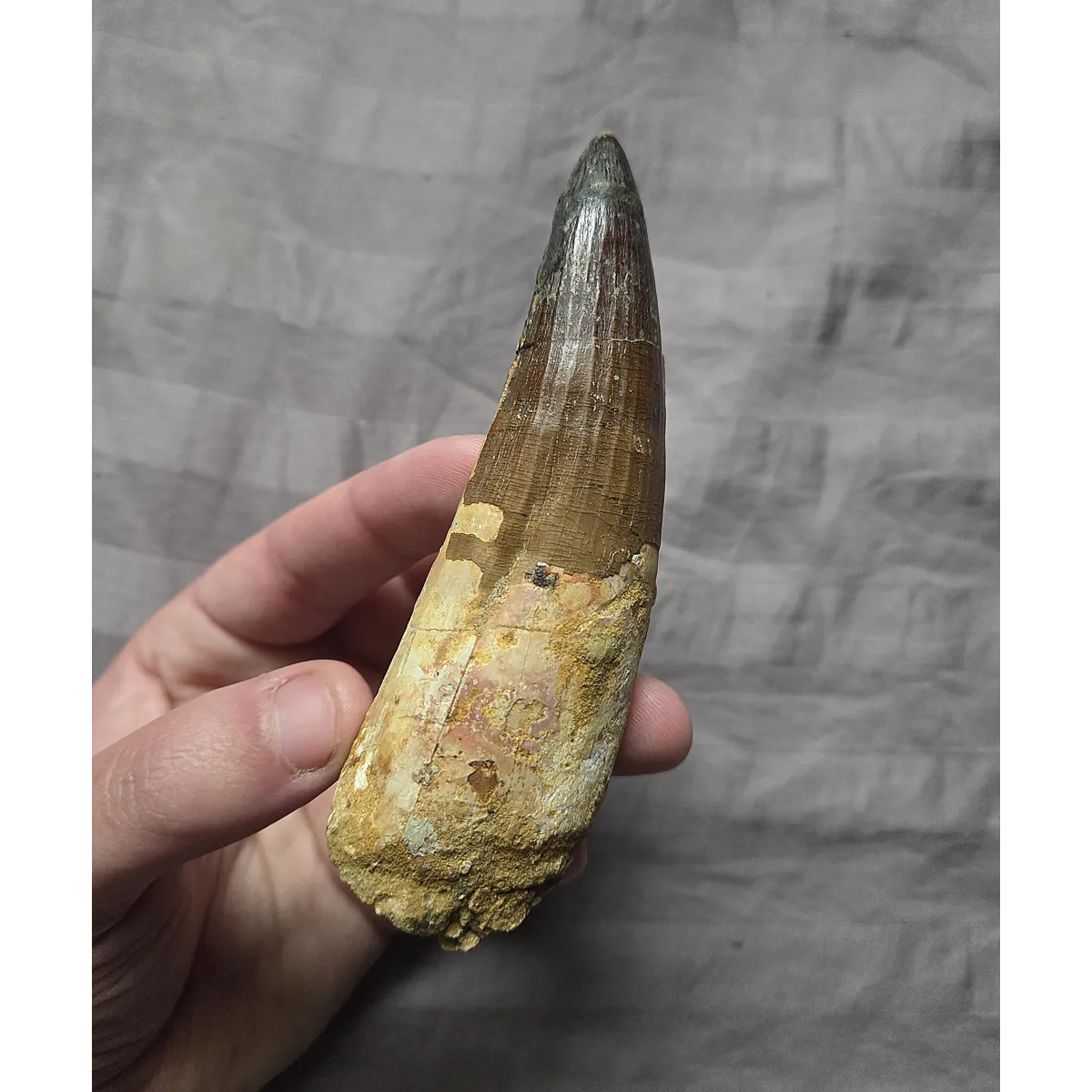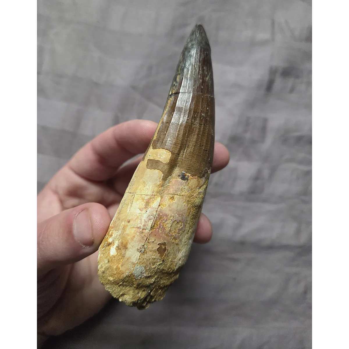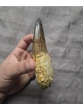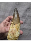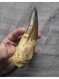 Here is a huge sized beautiful authentic Spinosaurus dinosaur tooth with a very rare pathology indent on the blade. A pathology is a form of morphological inconsistency/mutation that deviates from the norm in fossils. This piece was found in the late Cretaceous Kem Kem Beds of Morocco. The very tip on this tooth appears to be a likely comp but it blends well enough and on the brighter side at least the blade is real and especially the gorgeous root section. On display it eminates that classic huge, fat, and great looking Spinosaurus tooth centerpiece every fossil collector wants. So heres your chance to add an interesting, unique, and huge size Spinosaurus tooth to your collection at a great affordable price due to tip work, makes a perfect gift!