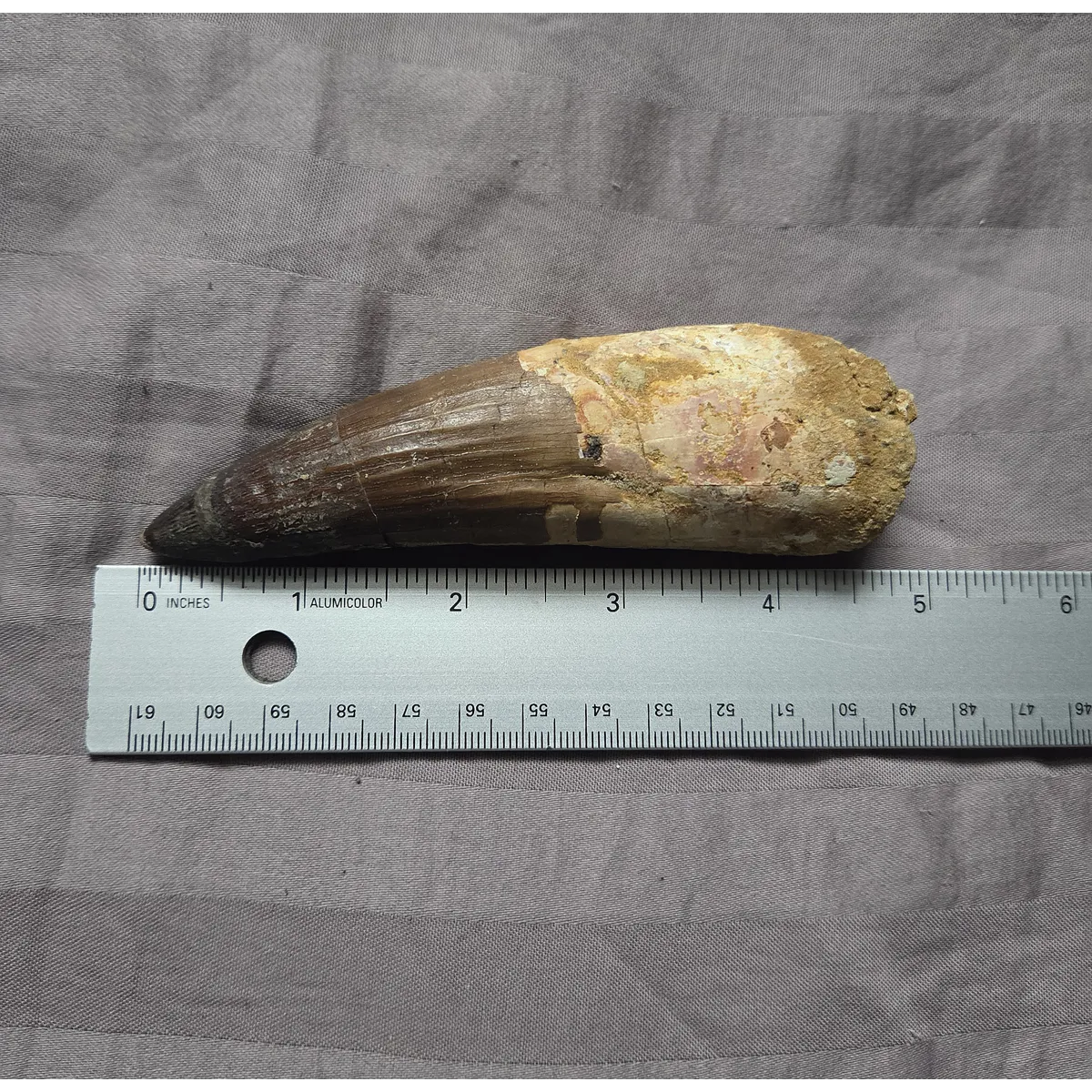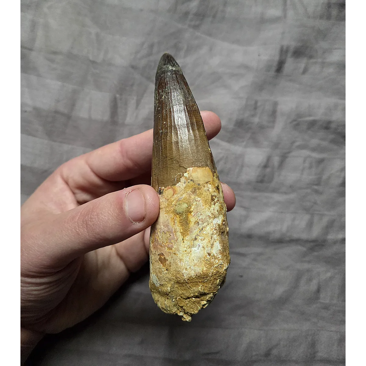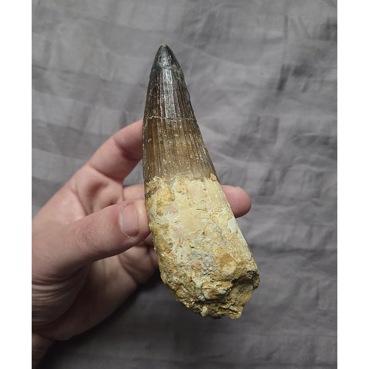 Here is a huge sized beautiful authentic Spinosaurus dinosaur tooth with a very rare pathology indent on the blade. A pathology is a form of morphological inconsistency/mutation that deviates from the norm in fossils. This piece was found in the late Cretaceous Kem Kem Beds of Morocco. The very tip on this tooth appears to be a likely comp but it blends well enough and on the brighter side at least the blade is real and especially the gorgeous root section. On display it eminates that classic huge, fat, and great looking Spinosaurus tooth centerpiece every fossil collector wants. So heres your chance to add an interesting, unique, and huge size Spinosaurus tooth to your collection at a great affordable price due to tip work, makes a perfect gift!